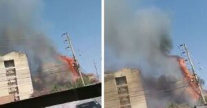 Footage circulating online shows intense flames consuming the upper floors of the building, with thick, dark smoke rising into the sky and shrouding the entire facade. The situation is made more dangerous by a nearby high-voltage power line that has caught fire, sending bright sparks and molten material raining down toward the street below.