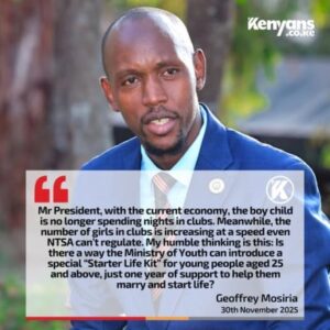 “Mr. President, with the economy as it is, many young people are prioritizing survival over marriage. My humble suggestion is whether the Ministry of Youth can introduce a ‘Starter Life Kit’ for all young adults aged 25 and above – a one-year support program to help them begin their lives and build stability,” Geoffrey Mosiria said further.